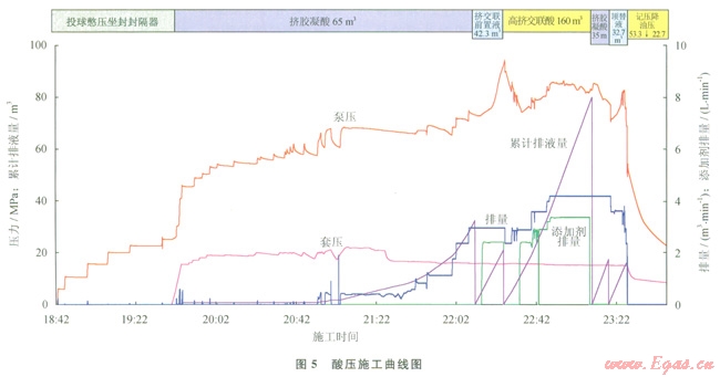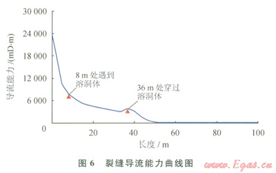 利用實驗確定了典型地質體的響應特征,以該響應特征為依據對實際井數(shù)據進行解釋,建立一系列的特征圖集或解釋圖版,在后續(xù)生產中可以用圖版對測井資料進行解釋[12-13]。圖4是塔里木油田A井的一段碳酸鹽巖段綜合解釋成果圖。從圖中可以看出XX20XX30m井段,成像測井在XX26m解釋一條40cm高的裂縫,孔隙度小于1.8%,電阻率大于1000W·m,綜合評價為Ⅲ類儲集層,開井流動曲線呈一條直線,關井壓力恢復緩慢,壓力歷史曲線反映測試層為特低滲透性儲集層,僅從常規(guī)分析這類儲集層即使酸化壓裂也不會獲得工業(yè)油氣流。而對應遠探測成像圖上可以看出在XX20XX28m距井壁310m的地方發(fā)現(xiàn)反射信息比較明顯,為雙邊成像,同相軸幾乎為直線,但兩側的同相軸延長線在在一條線上,裂縫角度較高,根據圖版可以評價為高角度井旁裂縫。建議中國石油塔里木油田公司勘探公司進行試油,該建議被采納,酸壓后6mm油嘴日產氣l0多萬立方米、油l0多立方米。從圖5酸壓施工曲線分析,擠膠凝酸注入過程壓力平穩(wěn)上升,人造裂縫正常延伸,沒有溝通儲層縫、洞的跡象;再次擠膠凝酸后,壓力有明顯下降,說明溝通了縫洞系統(tǒng)。從圖6裂縫導流能力曲線圖上分析在裂縫延伸方向8m處遇到溶洞區(qū),在36m處穿過溶洞區(qū)。證實遠探測聲波反射波成像解釋是正確的。