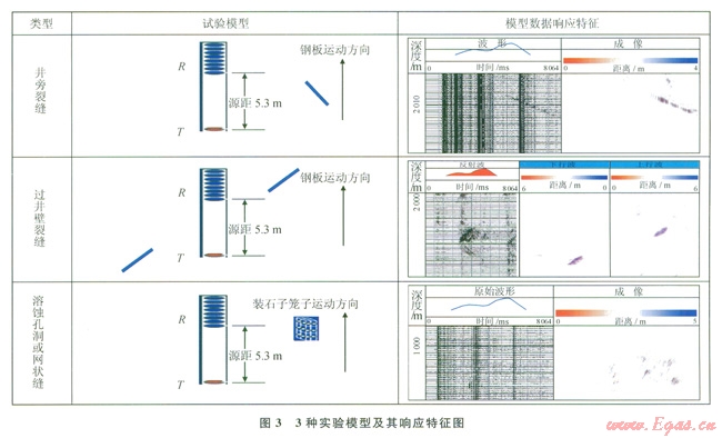 實驗過程中用2m×lm×1mm的鋼板模擬裂縫,用2m×lm×0.5m的鐵制網狀籠子裝上大小不等的鵝卵石模擬溶蝕孔洞,把儀器水平放入水中,保持儀器在水中靜止,模型做勻速運動,記錄一組數(shù)據,據此做不同類型的模擬實驗,得到各種響應特征。圖3是在消聲水池做的3類實驗模型及其響應特征圖。圖中井旁裂縫,鋼板中心位置距儀器3m,與儀器夾角為-20°(逆時針為負,順時針為正),儀器源距為5.3m,從原始波形圖上看,反射波的傾斜同相軸非常明顯,從模型來分析這種情況只有下行波,不存在上行波,因此,在處理過程中波分離后直接進行成像,沒有進行上下行波分離,得到一組單邊的條帶狀同相軸,其形狀、走勢、夾角與模型基本一致,同相軸的中點大約為3m與鋼板距儀器的距離一致;過井壁裂縫,兩塊一樣的鋼板分別放在儀器兩側與儀器的夾角為20°,兩塊板中點都距儀器3m,從原始波形上看有兩組不同走勢的反射波,從理論分析這種情況會出現(xiàn)上下行反射波,對其進行處理并雙邊成像,可以看出在上下行反射波成像圖上各有一組條帶狀的同相軸,且兩組同相軸在一條直線上;孔洞或網狀縫,用三角鐵焊成2m×1×0.5m的長方形骨架,然后用的鐵絲網把6個面封好,里面裝上鵝卵石來模擬溶蝕孔洞,放置中心距儀器3m,從理論分析這種模型的反射是雜亂無章的,處理過程中在波分離完直接對其進行了成像沒有進行上下行波的分離,從成像圖上看呈雜亂無章的斑點狀。