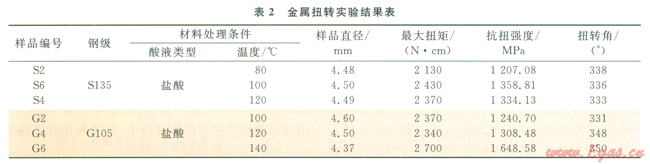 扭轉(zhuǎn)實(shí)驗(yàn)是按照國(guó)家標(biāo)準(zhǔn)GB/T l0128-2007金屬室溫扭轉(zhuǎn)試驗(yàn)方法來(lái)執(zhí)行。測(cè)試S135鋼和G105鋼在鹽酸基液中被腐蝕一定時(shí)間后力學(xué)性質(zhì),即抗扭強(qiáng)度。實(shí)驗(yàn)數(shù)據(jù)見(jiàn)表2所示。