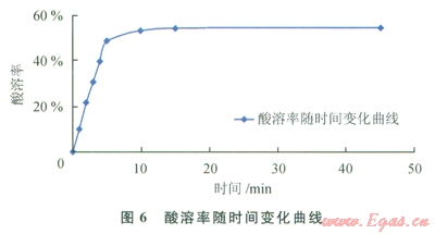 由圖6可知,隨著酸化時(shí)間的增加,酸溶率增大,反應(yīng)l0~15min基本結(jié)束,酸溶率可達(dá)到54.72%。因此在現(xiàn)場(chǎng)實(shí)際的操作過(guò)程中,有效酸化時(shí)間超過(guò)l5min,即可達(dá)到酸化解卡的效果。