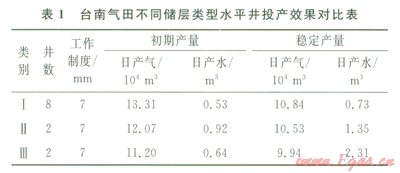 臺南氣田3種不同級別產(chǎn)層的水平井,投產(chǎn)初期日產(chǎn)能力相差不大,且產(chǎn)水量較低。對比分析一段時(shí)間之后的生產(chǎn)情況,存在Ⅰ類儲層開發(fā)效果好于Ⅱ類,Ⅱ類儲層又好于Ⅲ類和Ⅱ+Ⅲ過渡類儲層。水平井經(jīng)過一段時(shí)間的采氣生產(chǎn),雖然產(chǎn)量變化不大,但是除Ⅰ類產(chǎn)層之外,其他低級別類型的產(chǎn)層水平井日出水量均大于1m3,說明儲層類型級別越低,儲層其泥質(zhì)含量越高、含水飽和度越大,當(dāng)目的層壓力逐步降低時(shí),束縛水變?yōu)榭蓜铀?,?dǎo)致氣井出水量增加(表1)。