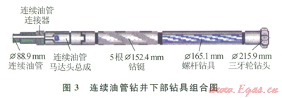 第二次開鉆進行連續(xù)油管鉆井試驗(3),Æ215.9mm鉆頭鉆達設(shè)計試驗井深350 m。主要鉆遇泥巖、頁巖和砂巖。鉆井參數(shù):鉆壓為2030kN,排量為1820Ls,泵壓為35MPa。鉆井液參數(shù):密度為1.051.15gcm3,漏斗黏度為3840s,API失水量為5mL,泥餅厚度為0.5mm。鉆具組合:Æ215.9mm鉆頭+Æ165.1mm螺桿鉆具+431×4A0接頭+5Æl52.4mm鉆鋌+4A1×310接頭+Æ120.65mm馬達頭總成+Æ139.7mm連接器+Æ88.9mm連續(xù)油管。