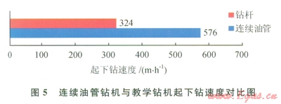 連續(xù)油管鉆井的一大優(yōu)點就是起下鉆無需接單根。在現(xiàn)場進行連續(xù)油管起下鉆時平均速度為0.16ms(576mh)(5)。而常規(guī)鉆井時,如果5min起下一根立根(27m),則起下鉆速度也僅為324mh,因此在鉆井試驗中連續(xù)油管起下鉆速度是常規(guī)鉆桿起下鉆速度的l.78倍。考慮到連續(xù)油管注入頭的最大提升速度是0.8ms,因此在保證起下鉆安全的情況下,連續(xù)油管起下鉆速度可以達到常規(guī)鉆桿起下鉆速度的3倍。