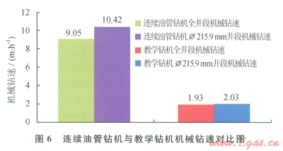 在相同地質(zhì)狀況和用同一臺鉆井泵的情況下,將連續(xù)油管鉆機與相距35.6m處宏華2號教學(xué)鉆機(ZJ40DBS鉆機+頂驅(qū))的鉆井情況進行對比如下: