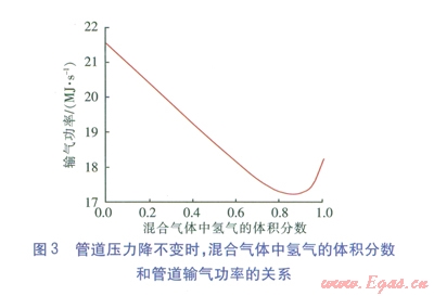 由圖3可知,氫氣加入到天然氣管道后,若保證壓力降不變,則無論氫氣的體積分數(shù)為多大,和輸送天然氣相比,管道的輸氣功率均是下降的,即管道的輸氣能力是降低的。當氫氣在混合氣體中的體積分數(shù)大于0.83后,管道的輸氣功率有小幅回升,但和輸送天然氣相比,管道的輸氣能力仍然是下降的。在圖1中也有相類似的情況,當氫氣在混合氣體中的體積分數(shù)為0.83左右時,混合氣體的華白數(shù)是最低的。