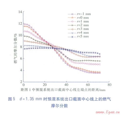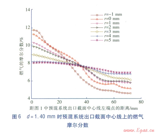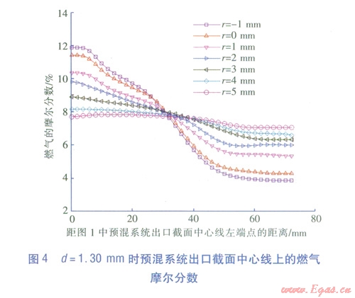 不同噴嘴直徑d 和噴嘴位置條件下,預(yù)混系統(tǒng)出口截面中心線上混合氣中燃?xì)獾哪柗謹(jǐn)?shù)見圖46可知,當(dāng)r=-1mmr=0mm時(shí),中心線上燃?xì)饽柗謹(jǐn)?shù)的不一致性非常明顯,摩爾分?jǐn)?shù)波動(dòng)范圍為4%12%。R越大,中心線上的燃?xì)獾哪柗謹(jǐn)?shù)一致性越好。當(dāng)r=4mm5mm時(shí),中心線上燃?xì)獾哪柗謹(jǐn)?shù)幾乎相同,這說明此條件下混合效果比較好。因此,為了實(shí)現(xiàn)燃?xì)夂涂諝獾耐耆A(yù)混,取r4mm
