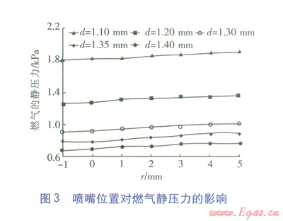 模擬的噴嘴位置對(duì)燃?xì)忪o壓力的影響見圖3。由圖3可知,噴嘴的直徑越小,燃?xì)馑枰撵o壓力越大。當(dāng)噴嘴的直徑d<1.30mm時(shí),燃?xì)獾撵o壓力大于1.0kPa。因此噴嘴的直徑應(yīng)大于1.30mm,否則電磁閥后(燃?xì)鈬娮烨埃┤細(xì)獾馁|(zhì)量流量將不能滿足燃燒器熱負(fù)荷的要求。