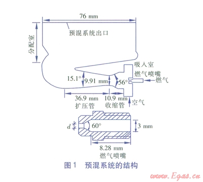 燃?xì)夂涂諝饣旌系男Ч麤Q定了燃燒效率和污染物的排放量。利用引射器實(shí)現(xiàn)燃?xì)夂涂諝馊A(yù)混,可以達(dá)到燃?xì)饪焖贌崴魅紵魅A(yù)混燃燒的目的。為了掌握預(yù)混系統(tǒng)幾何結(jié)構(gòu)參數(shù)對(duì)預(yù)混效果的影響,建立了燃?xì)夂涂諝忸A(yù)混系統(tǒng)數(shù)學(xué)模型,利用fluent軟件對(duì)燃?xì)夂涂諝忸A(yù)混系統(tǒng)進(jìn)行模擬。