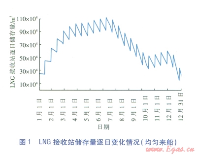 本方法綜合考慮目標(biāo)天然氣市場用氣需求情況、用氣特性、上游LNG來船情況,LNG接收站天然氣外輸量、LNG船卸載量、站內(nèi)LNG儲存量等指標(biāo)采用計算機編程進(jìn)行動態(tài)分析,得出在均勻來船的情況下LNG接收站儲存規(guī)模、LNG接收站儲存量每日變化情況、LNG作為調(diào)峰的主力氣源時其所需要的儲罐數(shù)量及船期等情況。該動態(tài)分析方法還可以通過調(diào)整上游LNG運輸鏈中LNG船的船期用于“平谷抑峰”,既保障下游供氣和調(diào)峰的要求,又可以降低LNG接收站儲存規(guī)模,減少站內(nèi)LNG儲罐數(shù)量,減少LNG接收站投資。