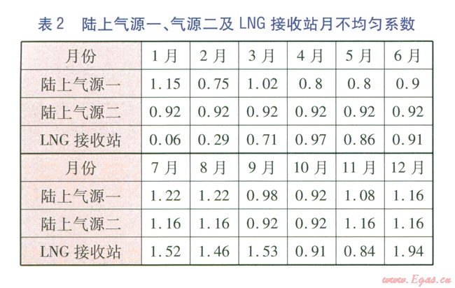 該地區(qū)共存在4種氣源供氣,其中陸上氣源一供氣量為30×108m3a,陸上氣源二供氣量為18×108m3a,陸上氣源三供氣量為36×108m3aLNG氣源供氣量為30×108m3a。陸上氣源一和氣源二月供氣特性見表2;陸上氣源三為均勻供氣。LNG接收站用于承擔(dān)該地區(qū)除陸上氣源調(diào)峰外的所有季節(jié)調(diào)峰,可通過供需平衡和各氣源供氣特性計算出每月LNG接收站外輸量,得出LNG接收站供氣的月不均勻系數(shù)(見表2)。