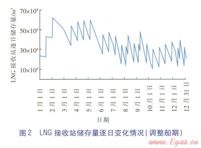 假設(shè)該LNG接收站LNG設(shè)計儲存規(guī)模為64×104m3 (416×104m3LNG儲罐),通過動態(tài)分析方法計算結(jié)果可知,每年需調(diào)整LNG船的船期,其中:2、3、5月份需各減少接收lLNG;8、912月份需各增加接收lLNG;其余月份仍保持每月接收2LNG不變。通過調(diào)整船期方法得到的LNG接收站儲存量逐日變化情況見圖2.