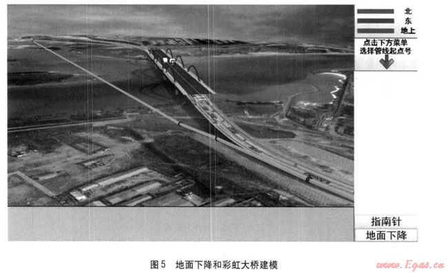 通過點(diǎn)擊“地下管道”,地面會“下降”,將地下管道顯示出來,通過地面下降可以清楚地看到管道的位置,周邊的建筑情況(見圖5)。