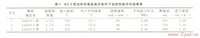 使用PP-1型高溫高壓泡沫評(píng)價(jià)裝置測(cè)定高溫高壓條件下KY-2泡排劑動(dòng)態(tài)性能,其測(cè)試結(jié)果見(jiàn)表1。實(shí)驗(yàn)數(shù)據(jù)表明在進(jìn)口溫度