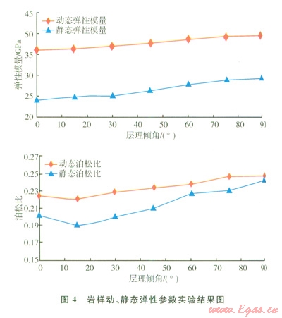 利用實驗數據,可以得到巖石動態(tài)彈性模量和泊松比的各向異性程度分別為0.0880.089,巖石靜態(tài)彈性模量和泊松比的各向異性程度分別為0.1800.155。可以看出巖石各向異性在靜態(tài)時更為突出,而動態(tài)時巖石各向異性有所減弱。巖石各向異性指數可評價巖石的各向異性程度,各向異性指數越大,表明巖石的各向異性程度越高。