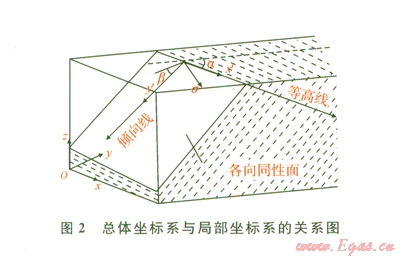 在實際工程中,由于地層存在一定的走向和傾角,通常和上述坐標系不一致,如圖2所示。需要選用總體坐標系(x,y,z)??傮w坐標系(x,y,z)和各向異性定向坐標系(x',y',z)的關系可通過走向角(α)和傾向角(α)建立。