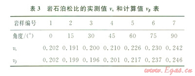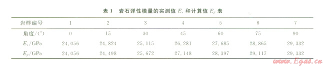 從表2可以看出,計算的彈性模量與實測值接近,最大誤差為3%。因此,只要對巖石作平行和垂直層理以及45°方向的3組樣品單軸壓縮實驗,就可用計算值來代替樣品的實測值,而不需要對每一個方向(β角)的樣品進行單軸壓縮實驗來確定模量,可省去大量樣品加工及實驗工作。結果表明將層理巖石視為橫觀各向同性介質來計算彈性模量是可行的。