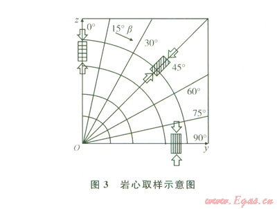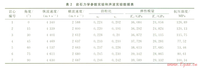 為探討層理頁巖的各向異性,按一定的β方向取樣(β角為層理而與巖樣端面問的夾角)。β角從0°~90°,每隔l5°取l個樣,共計7個樣(3)。巖樣上下端面的不平行度小于0.2 mm。對每塊巖樣做單軸壓縮實驗,測定巖石抗壓強度、彈性模量、泊松比,并且在實驗中測量每塊巖樣的彈性波速度VpVs[5-7]。