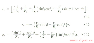 根據單軸壓縮邊界條件,若沿z軸方向壓縮,即應力以σx=σy=τxy=τyz=τzx=0,而β≠0,由式(7)