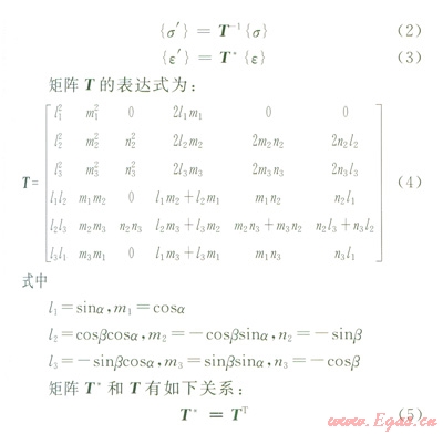 借助轉換矩陣TT*,把總體坐標系中的應力{σ}和應變{ε}分別換算為局部坐標系中的應力{σ'}和應變{ε'}