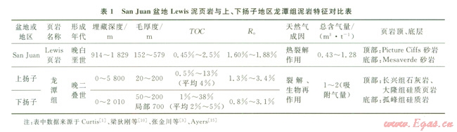 揚(yáng)子地區(qū)龍?zhí)督M頁巖與美國(guó)San Juan盆地Lewis頁巖的沉積環(huán)境十分相似,故將各類參數(shù)進(jìn)行對(duì)比總結(jié)(表1)。