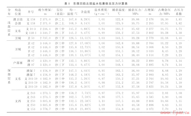 表l是對東濮凹陷中央隆起帶北部多口井不同層段鹽水包裹體捕獲壓力的計(jì)算結(jié)果。分析表明,研究區(qū)深部層系流體包裹體古剩余壓力和古壓力系數(shù)較高,其中衛(wèi)城南部、戶部寨、文東等地區(qū)沙三中、下亞段古剩余壓力為7.29~11.22 MPa,古壓力系數(shù)介于1.23~1.42,而且文東地區(qū)距離洼陷巾心較近的文203—59井的超壓幅度要高于距離洼陷中心較遠(yuǎn)的濮深7井,說明這些部位油氣的充注是在高壓系統(tǒng)內(nèi)完成的;文西地區(qū)沙三中弧段古剩余壓力為l.9~10.66MPa,古壓力系數(shù)為1.06~1.35,說明這些部位油氣的充注是在較高壓高壓系統(tǒng)內(nèi)完成的。