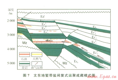 屬于鹽上油氣藏的油氣成藏模式類型。斷裂帶下部鹽間或鹽下地層中的砂體是油氣幕式運(yùn)移的臨時(shí)倉儲層或“中轉(zhuǎn)站”,由于下部流體的超壓作用,這些砂體中的流體沿?cái)鄬又芷谛葬尫哦鴮⒂蜌獯罅哭D(zhuǎn)移到上部地層。主要發(fā)生于斷裂活動期,具有早期充注的特點(diǎn),以衛(wèi)城地區(qū)向南至文留地區(qū)為代表(圖6)。該成藏模式具有如下特點(diǎn):①具有沙三上、中、下亞段3套烴源巖供烴;②以垂向幕式運(yùn)移為主、側(cè)向運(yùn)移為輔;③圈閉類型主要為復(fù)雜斷塊圈閉;④運(yùn)移動力主要是超壓;⑤縱向上烴類聚集層系沿主干斷裂呈羽狀分布。