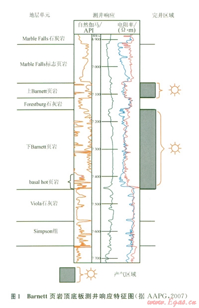 基于技術(shù)和成本方面的考慮,國外對(duì)頂、底板的研究歷來比較重視[4-5]。北美一些主要的頁巖氣盆地大都具有“三明治”式的展布特征。以美國福特沃斯盆地著名的Barnett頁巖為例,上Barnett頁巖以Marble Falls石灰?guī)r為頂板,Forestburg石灰?guī)r作為底板,圖1顯示,頂?shù)装逄帨y(cè)井響應(yīng)特征為低自然伽馬值、高電阻率;而上Barnett頁巖段則顯示為高伽馬值、低電阻率的特征,可以明顯區(qū)分。下Barnett頁巖則是以Forestburg石灰?guī)r和Viola石灰?guī)r分別作為頂、底板,相應(yīng)的頁巖氣藏也位于頂、底板之間的含氣泥頁巖層段內(nèi),封閉性較好。頂、底板封閉的含氣泥頁巖段為主力產(chǎn)氣層[6]。