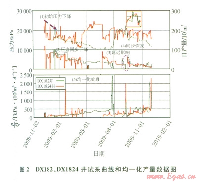 DX182、DX1824兩口井的試采曲線形態(tài)都有一個(gè)初始的壓力下降過(guò)程,隨著生產(chǎn)進(jìn)行一段時(shí)間之后,二者壓力表現(xiàn)為同步下降。但是,當(dāng)DX182井關(guān)井之后,DX1824井的套壓由逐步下降的趨勢(shì)變?yōu)槠骄彛f(shuō)明DX182井的關(guān)井對(duì)DX1824井有一個(gè)延遲影響。2 009年9月,在兩口井同時(shí)關(guān)井之后,這兩口井的壓力恢復(fù)到一個(gè)比較接近的值。最后,對(duì)這兩口井壓力、產(chǎn)量進(jìn)行均一化處理,曲線的趨勢(shì)也大體接近[7-8](圖2)。因此,試采曲線表明,DXl82、DXl824兩口井連通。