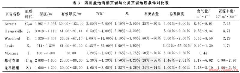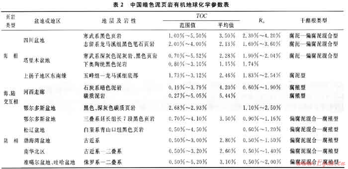 中國暗色泥頁巖分布時代多、面積較廣,就全國而言從震旦系-新近系均有分布,區(qū)域上遍及全國。從沉積環(huán)境上講,由海相一海、陸交互相-陸相均發(fā)育較厚的暗色泥頁巖。暗色泥頁巖有機質(zhì)含量、熱演化程度等指標(biāo)與美國主要暗色泥頁巖有不少相似之處(表4~6)。