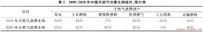 中國(guó)天然氣下游市場(chǎng)用戶主要集中在發(fā)電、民用、工業(yè)燃料、建筑物燃料、交通運(yùn)輸燃料、工業(yè)原料等6大領(lǐng)域。2009、2020年中國(guó)天然氣消費(fèi)比例統(tǒng)計(jì)、預(yù)計(jì)情況如表2所示[5]。