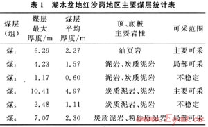 紅沙崗地區(qū)共含6個煤層(組)[5~6],總厚度介于3~35m(圖3),煤層自上而下依次編號為煤1~煤6層(組)(表1)。其中煤1和煤4層(組)層位穩(wěn)定,且分布面積廣,為主要可采煤層,也是煤層氣主要勘探目的層;煤2、煤6層(組)為局部可采煤層;煤3、煤5層(組)極不穩(wěn)定。煤1、煤2、煤3層(組)位于中巖組下部,煤4、煤5、煤6層(組)位于下巖組上部[7]。