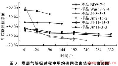 2) 通過甲烷在解吸吸附過程中碳同位素的分餾效應(yīng),可以判斷煤層氣成藏過程。在煤層氣開發(fā)過程中,可以建立某一區(qū)塊煤層氣開發(fā)井的甲烷碳同位素值的標(biāo)準(zhǔn)變化曲線,從而根據(jù)開發(fā)井甲烷碳同位素的值來判斷煤層氣井的開發(fā)狀態(tài)及采收率。