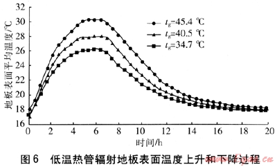 低溫?zé)峁茌椛涞匕宀煌谒芰下窆艿匕?,區(qū)別在于:塑料埋管地板中,熱水作為傳輸介質(zhì)將熱量帶入塑料埋管,并通過對(duì)流換熱的方式加熱管壁,進(jìn)而以整個(gè)地板表面為輻射面,使圍護(hù)結(jié)構(gòu)和空氣溫度升高;熱管輻射地板中,熱水仍作為熱量的傳輸介質(zhì),但放熱過程是通過熱管內(nèi)工質(zhì)的冷凝來實(shí)現(xiàn)的。