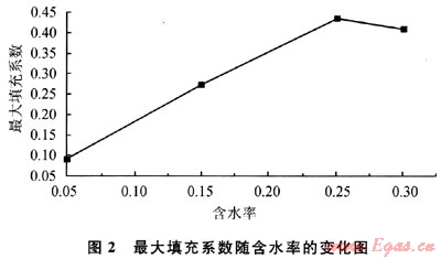 其得到的結(jié)果顯示在含水率小于30%時(shí),可以用最大填充系數(shù)值Φmax為0.57來計(jì)算,并且計(jì)算的結(jié)果與實(shí)驗(yàn)的測量值很吻合。本實(shí)驗(yàn)所使用的柴油黏度為5.12mPa·s,試圖運(yùn)用Pauchard的方法來尋求一個(gè)適當(dāng)?shù)?Phi;max值進(jìn)行漿液黏度的預(yù)測,因此,反算出了在不同含水率下的Φmax值,如圖2所示。計(jì)算結(jié)果顯示含水率分別為25%和30%時(shí)的最大填充系數(shù)分別為0.436和0.414;而當(dāng)含水率分別為5%和15%時(shí)的最大填充系數(shù)分別為0.093和0.275。本結(jié)果與文獻(xiàn)中的差異可能是由于所選用的實(shí)驗(yàn)介質(zhì)和環(huán)境不同等綜合因素引起的。從圖2中還可以發(fā)現(xiàn):在含水率小于25%時(shí)最大填充系數(shù)隨著含水率的增加而增加,幾乎呈線性關(guān)系,以此擬合出填充系數(shù)與含水率的關(guān)系: