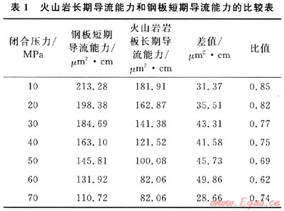 在閉合壓力一定的情況下,火山巖巖板長期導流能力比鋼板短期導流能力低28.66~49.86ftm2·cm,火山巖巖板長期導流能力和鋼板短期導流能力之比值為0.62~0.85。不同閉合壓力下的兩者的比值也不一樣(表1)。因此為了得到準確的長期導流能力巖板的長期導流能力實驗是必要的。以往的國內(nèi)壓裂設(shè)計在沒有長期導流能力實驗系統(tǒng)的情況下,有經(jīng)驗的壓裂設(shè)計人員經(jīng)常取短期值的1/3作為計算機程序設(shè)計軟件的輸入數(shù)據(jù),以此來降低因?qū)Я髂芰Σ钪翟斐傻挠嬎憬Y(jié)果的誤差。
