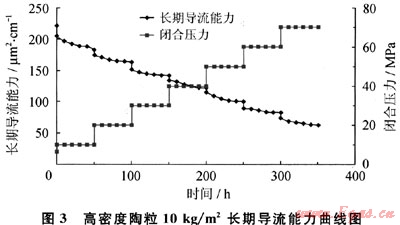 長期導流能力的實驗條件均考慮了地層溫度、地層鹽水的影響,為了實際考察支撐劑嵌入地層的影響,使用了火山巖巖板。實驗連續(xù)運轉(zhuǎn),實驗時間超過300h。
