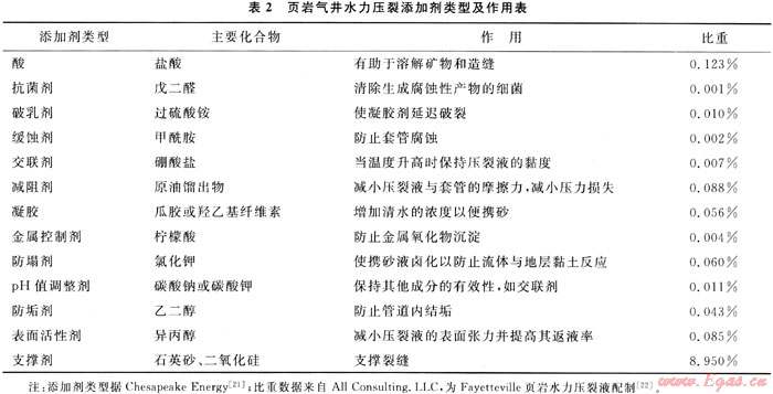 無論是在頁巖氣開發(fā),還是在常規(guī)油氣開發(fā)的壓裂過程中,壓裂液及其性能都是影響壓裂最終效果的重要因素。壓裂液及其性能對能否造出一條足夠尺寸的、有足夠?qū)Я髂芰Φ牧芽p有直接關系。清水壓裂液組成以水和砂為主,含量占總量的99%以上,其他添加劑成分占壓裂液總量的不足1%。添加劑在壓裂液中所占的比例很小,但對提高頁巖氣井的產(chǎn)量說卻是至關重要。頁巖水力壓裂常見添加劑類型及其作用見表2。
