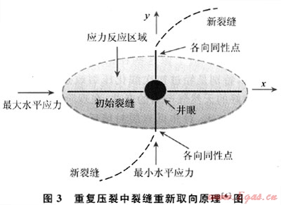 重復壓裂是指當頁巖氣井初始壓裂處理已經(jīng)無效或現(xiàn)有的支撐劑因時間關系損壞或質(zhì)量下降,導致氣體產(chǎn)量大幅下降時,采用壓裂工藝對氣井經(jīng)行重新壓裂增產(chǎn)的工藝。頁巖氣井初始壓裂后,經(jīng)過一段時間的生產(chǎn),井眼周圍的應力會發(fā)生變化,重復壓裂能夠重新壓裂裂縫或使裂縫重新取向,使頁巖氣井產(chǎn)能恢復到初始狀態(tài)甚至更高(圖3)。美國Barnett頁巖在1995年前廣泛使用凝膠壓裂,1997年開始發(fā)展清水壓裂,作業(yè)者對先前使用凍膠壓裂增產(chǎn)產(chǎn)量下降的井使用清水壓裂重新改造,改進處理液回收工作流程,氣井產(chǎn)量明顯提高,部分井產(chǎn)量甚至超過了初次壓裂時的產(chǎn)量[5]。
