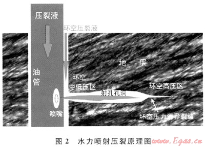 水力噴射壓裂是用高速和高壓流體攜帶砂體進行射孔,打開地層與井筒之間的通道后,提高流體排量,從而在地層中打開裂縫的水力壓裂技術(圖2)。當頁巖儲層發(fā)育較多的天然裂縫時,如果用常規(guī)的方式對裸眼井進行壓裂,大而裸露的井壁表面會使大量流體損失,從而影響增產(chǎn)效果。水力噴射壓裂能夠在裸眼井中不使用密封元件而維持較低的井筒壓力,迅速、準確地壓開多條裂縫。2005年,水力噴射壓裂技術第一次使用在美國Barnett頁巖中,作業(yè)者使用水力噴射環(huán)空壓裂工藝對Barnett頁巖中的53口井進行了壓裂,其中26口井取得了技術和經(jīng)濟上的成功,有21口井被認定為技術成功[4]。