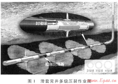多級壓裂的特點是多段壓裂和分段壓裂,它可以在同一口井中對不同的產(chǎn)層進行單獨壓裂。多級壓裂增產(chǎn)效率高,技術成熟,適用于產(chǎn)層較多,水平井段較長的井(圖1)。頁巖儲層不同層位含氣性差異大,多級壓裂能夠充分利用儲層的含氣性特點使壓裂層位最優(yōu)化。在常規(guī)油氣開發(fā)中,多級壓裂已經(jīng)是一個成熟的技術,國內(nèi)有很多成功應用的實例。多級壓裂技術用于我國的頁巖氣開發(fā)有一定的技術基礎,是可行的壓裂技術。