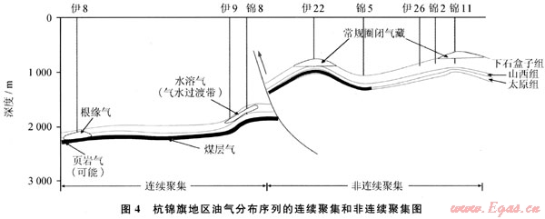 分布特征是從靜態(tài)要素對已形成的油氣藏進行研究,主要表現(xiàn)為油氣藏在盆地平面、剖面上的分布特征,從盆地中心向邊緣、從深部向淺部依次由烴源巖內(nèi)部自生白儲的煤層氣或頁巖油氣過渡到烴源巖和儲層直接接觸的根緣油氣,進而過渡到烴源巖和儲層有一定距離的水溶氣和常規(guī)圈閉油氣,連續(xù)聚集通常具有超壓的特征。