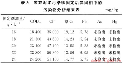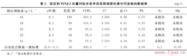 表2數(shù)據(jù)表明:隨著固定劑PJNJ-3的加入,廢棄泥漿分離出的固相物浸出液中主要污染物COD和色度在降低,總Cr和Pb的濃度略有增加,但不明顯,當(dāng)加量達(dá)到20g/L以上時,浸出液中各項污染物指標(biāo)均能滿足污水綜合排放一級標(biāo)準(zhǔn)要求。