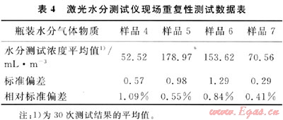 在A、B輸氣點站安裝SS2000激光水分測試儀,運行6個月后,采用中國測試技術(shù)研究院制備的4瓶瓶裝水分氣體物質(zhì)(補充氣分別為氮氣和甲烷),對儀器的重復(fù)性進(jìn)行了考察。實驗結(jié)果見表4。