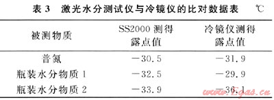 天然氣水分測試常用的測試技術(shù)有冷鏡法、電解法、Al2O3電容法和石英晶體法等[5]。在實驗室對SS2000激光水分測試法與冷鏡法進(jìn)行了比對(冷鏡儀由中國測試技術(shù)研究院進(jìn)行檢定),被測物質(zhì)分別為普氮和瓶裝水分物質(zhì)(補充氣為甲烷),濃度值與露點值之間的轉(zhuǎn)換采用ASTM1142標(biāo)準(zhǔn),比對結(jié)果見表3。