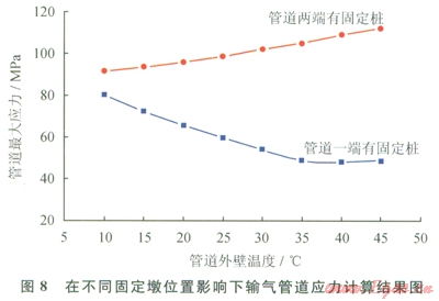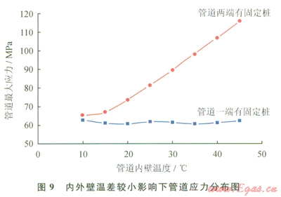 由計(jì)算結(jié)果分析,管道上下兩端有固定墩約束時(shí)較管道一端有固定墩約束事產(chǎn)生了較大應(yīng)力。兩端有固定墩約束時(shí),管道應(yīng)力隨著內(nèi)外壁溫差的減小而增大。這是由于溫度增加造成管道內(nèi)等效熱應(yīng)力增加。由于兩端固定,輸氣管道在軸向上不能得以伸長(zhǎng),應(yīng)力得不到有效釋放,因此,管道為克服熱脹冷縮效應(yīng)及位移約束而產(chǎn)生了較大不均勻分布的應(yīng)力。管道一端固定,應(yīng)力隨著溫差的減小而減小,這是由于溫差減小,管道不均勻分布的應(yīng)力隨著軸向的伸長(zhǎng)變形得以釋放而減小。由此可知,為減小管道應(yīng)力,設(shè)置固定墩時(shí),間距應(yīng)增大,并且保持在一定的范圍內(nèi),既能減小軸向變形又能滿足應(yīng)力釋放,從而減小管道應(yīng)力大小。