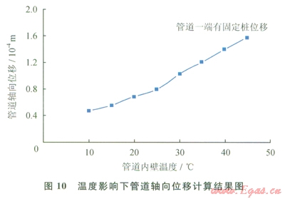 由計(jì)算結(jié)果可知,相對(duì)于管道一端有固定墩約束,管道兩端有固定墩約束時(shí)產(chǎn)生的應(yīng)力較大。在內(nèi)外壁溫差較小時(shí),隨著輸氣溫度的增加,管道一端有固定墩時(shí)產(chǎn)生的熱應(yīng)力趨于水平,由此可知溫度對(duì)管道應(yīng)力影響較小,這是因?yàn)檩S向伸長(zhǎng)得到補(bǔ)償從而減小了管道產(chǎn)生的集中應(yīng)力。在內(nèi)外壁溫差保持不變時(shí),管道應(yīng)力不發(fā)生較大變化。在內(nèi)外壁溫差較小時(shí),管道兩端有固定墩約束情況下管道最大應(yīng)力隨輸氣溫度的增加而明顯增加,遠(yuǎn)大于管道一端有固定墩約束時(shí)產(chǎn)生的應(yīng)力。管道內(nèi)輸氣壓力的增加造成管道應(yīng)力增加。在溫度影響下管道一端有固定墩約束時(shí)軸向位移計(jì)算結(jié)果如圖l0所示。