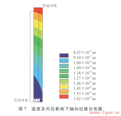 由分析可知,在內(nèi)壓和溫度影響下,最大應(yīng)力在管道內(nèi)壁產(chǎn)生,約50 MPa。由此可知,溫度作用中內(nèi)壓的變化會(huì)影響管道應(yīng)力大小及分布。由于管道只有一端有固定墩約束,管道司以沿軸向嚴(yán)生伸長(zhǎng)變形,應(yīng)力通過軸向伸長(zhǎng)得以補(bǔ)償而減小,軸向最大位移為0.Ol62mm。