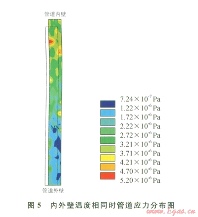 管道輸氣過程中受到上覆土層壓力、內(nèi)部氣體壓力及溫度作用[14-17]。由于管道外壁防腐層不具有保溫作用,外壁接觸地層,溫度部分傳導(dǎo)進(jìn)地層造成熱量損耗,管道內(nèi)外壁將產(chǎn)生溫差。氣候條件及輸氣距離的變化也會(huì)造成地層和管道外壁熱傳導(dǎo)效應(yīng)的變化,管道內(nèi)外壁溫差逐漸增加。圖4為內(nèi)外壁存在溫差下管道溫度分布特征圖,圖5為內(nèi)外壁溫度相同時(shí)管道應(yīng)力分布圖。