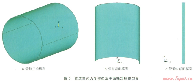根據(jù)彈性力學(xué)和有限元理論,管道熱應(yīng)力和外擠載荷的空間問題可以應(yīng)用平面應(yīng)力及軸對(duì)稱建立平面有限元模型,計(jì)算分析管道的應(yīng)力分布及大小如圖3所不。圖3-a1219mm外徑X80管道空間力學(xué)模型;圖3-bX80管道三維剖面,以2軸為對(duì)稱軸;圖3-c為管道縱軸旋轉(zhuǎn)截面,以z軸為對(duì)稱軸旋轉(zhuǎn)。