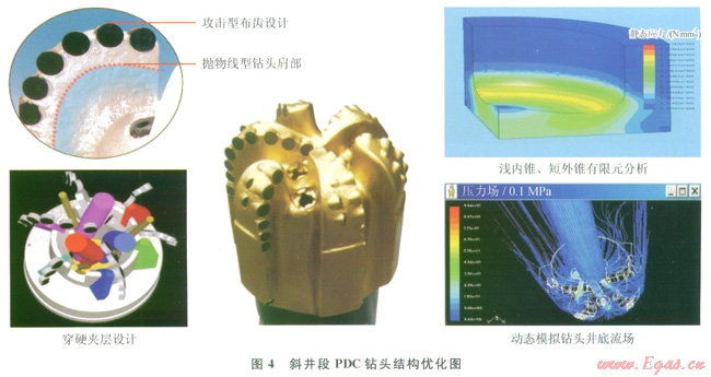 對其模擬定向鉆進有限元力學(xué)分析表明,在一定的鉆壓下,短外錐的PDC鉆頭受力均勻,拋物線形鉆頭肩部外形的連續(xù)性過渡可消除集中點載荷,這更有利于PDC鉆頭的穩(wěn)定性。外錐短拋物線可以減小鉆頭與井壁的接觸面積,從而減小鉆頭與井壁之間的摩擦力,減輕鉆頭與井壁摩擦導(dǎo)致的鉆頭渦動,提高了鉆頭定向反應(yīng)靈敏度。攻擊型布齒設(shè)計既保證鉆頭能吃入硬夾層,且鉆頭鉆出硬夾層時切削齒不損壞。此外,增加鉆頭鼻部至保徑部分切削齒的投影密度,有利于保護切削齒,增強鉆頭穿硬夾層的能力和加強保徑的能力。在斜井段施工過程中,這種結(jié)構(gòu)的PDC鉆頭在較小的鉆壓下就能獲得比常規(guī)PDC鉆頭更高的鉆速,同時由于扭矩較小,鉆頭穩(wěn)定性強,工具面更加穩(wěn)定,使斜井段平均機械鉆速、單只鉆頭進尺與壽命大幅提高。